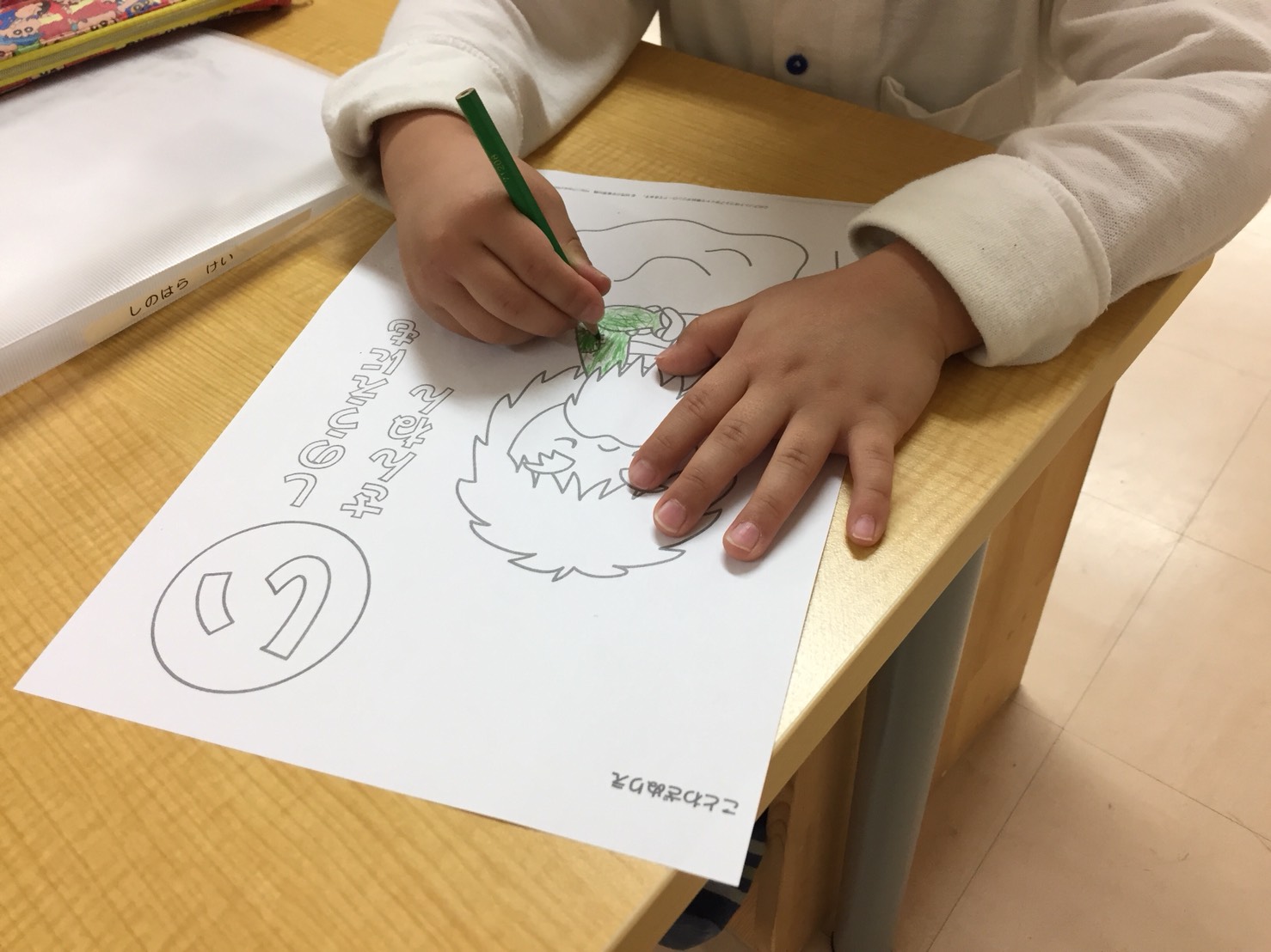 たかが塗り絵 されど塗り絵! はみ出さない、筆圧などに気を付けて塗ります。手を止めずに塗りながらも 先生から色々な質問が飛んできます。「自分の気持ち」「自分の意見」を伝えます。 コミュニケーションの力をつけます。