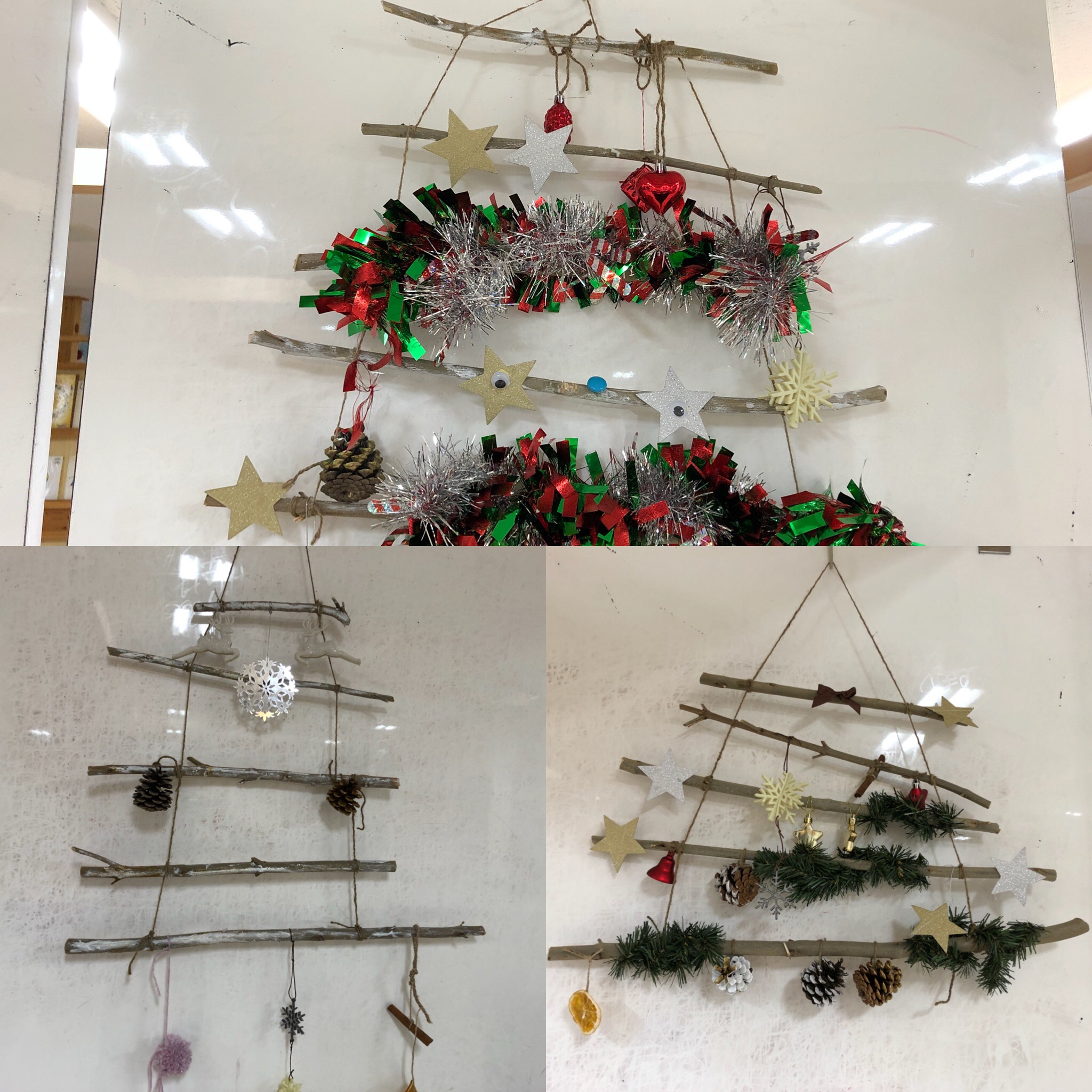 飾りは拾ってきた松ぼっくりや、家にあった毛糸やリボン.手作りは楽しい!手先の器用な女子のおかげで 教室が一気にクリスマスモード🎄