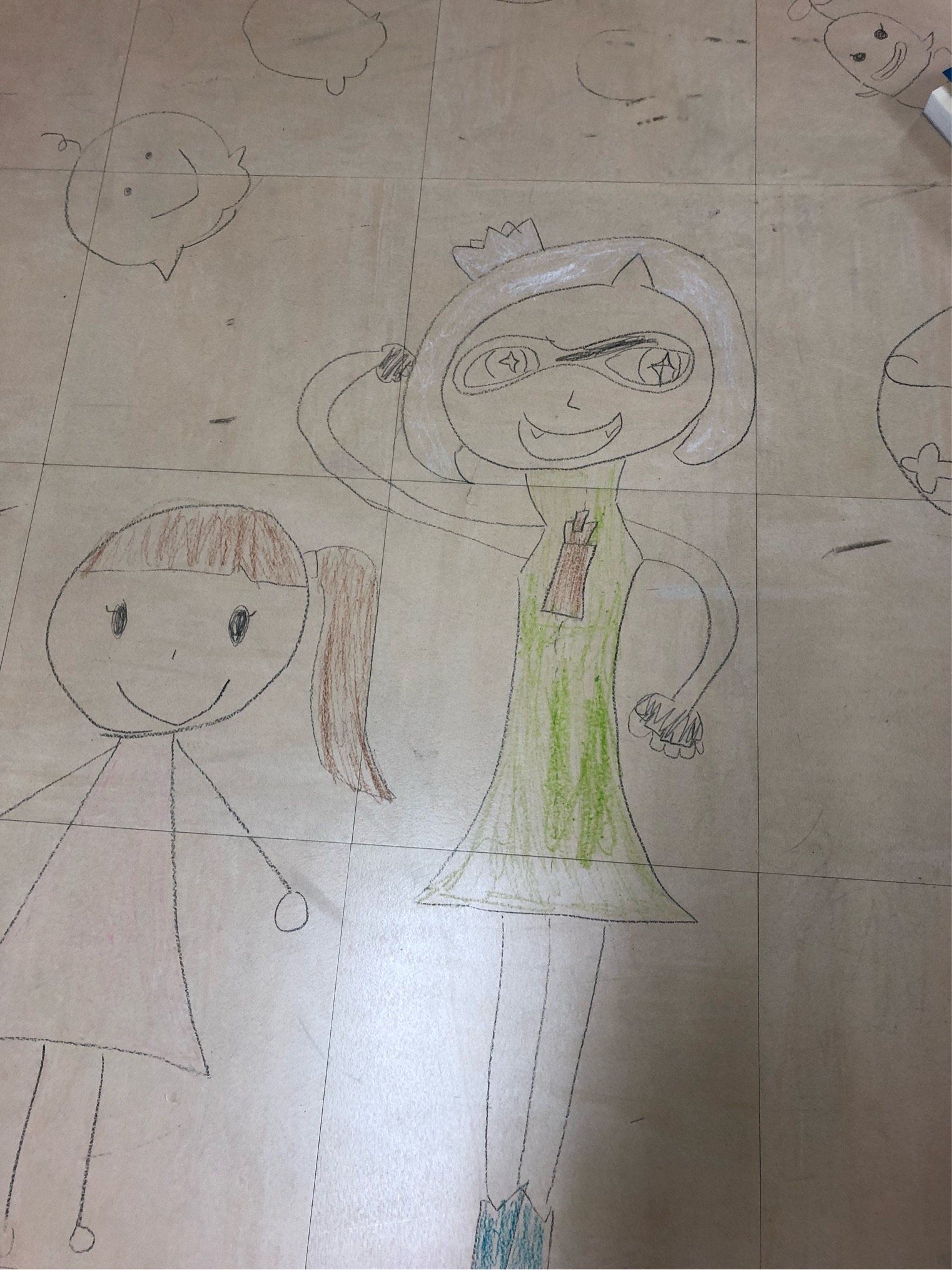 床にかわいいお絵描き発見!(水ぶきで消えるクレヨンです)床と言う大きなキャンバスにのびのび書いている絵が可愛すぎる💛
