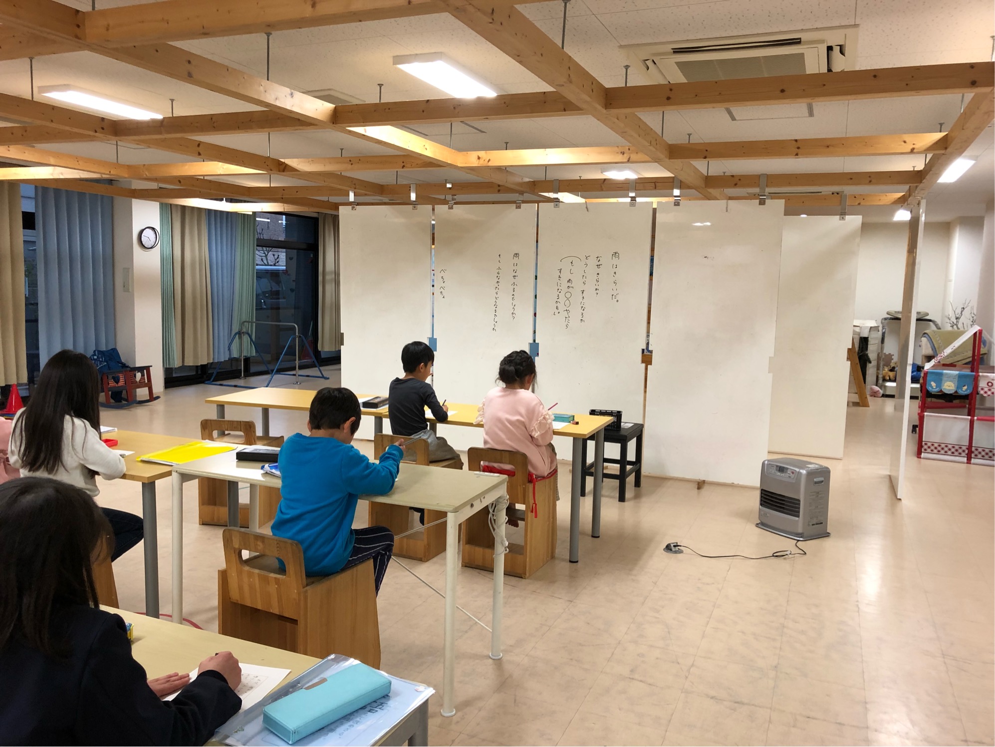 今日は大雨の中でも休まず来た子供たち。濡れた靴下をストーブで乾かしたりと、しっかりしています。