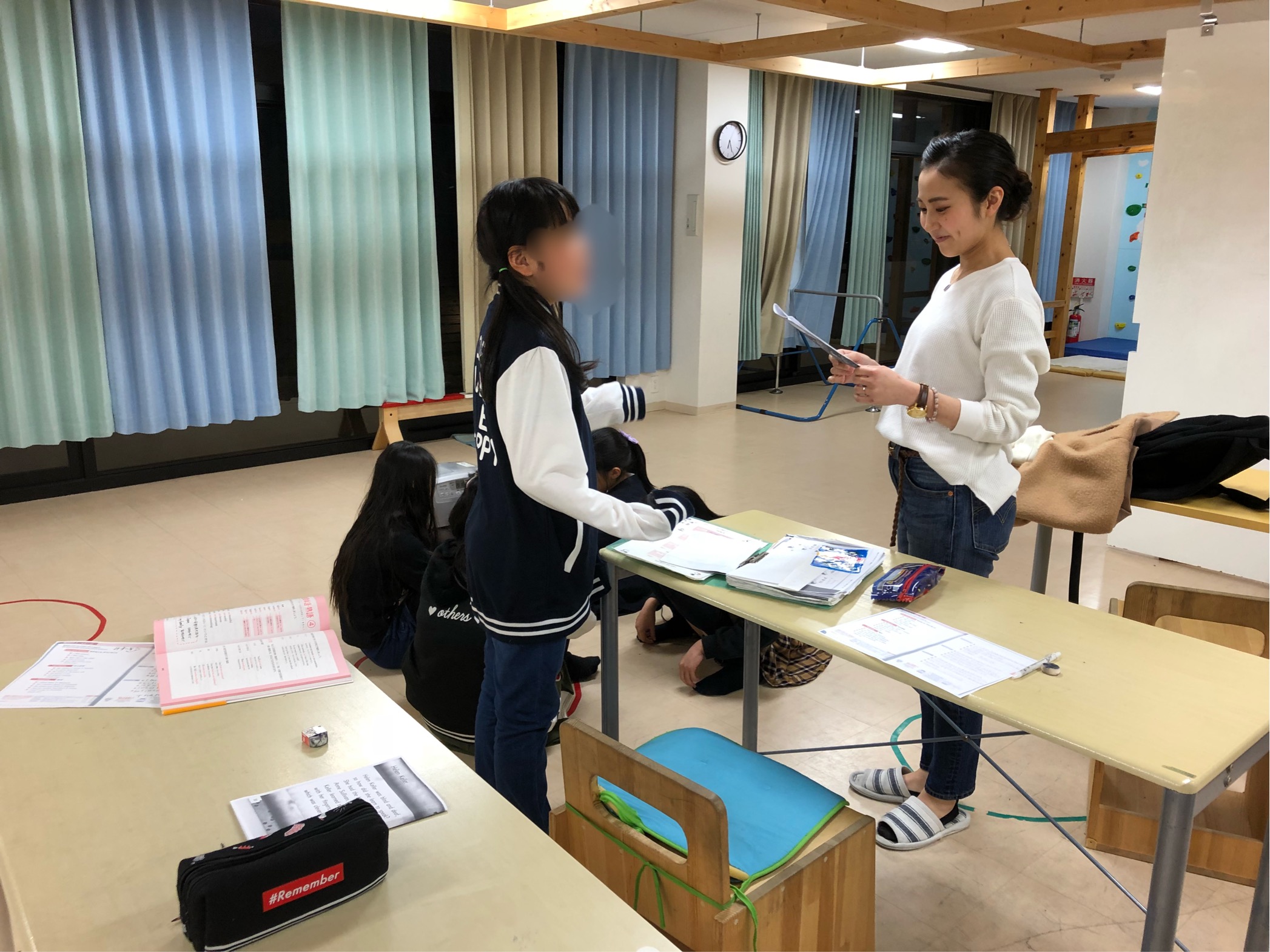 小学4年生以上のお姉さんのクラスは、かっこよくスピーチするための台本作り。先生に聞いてもらって練習バッチリ。