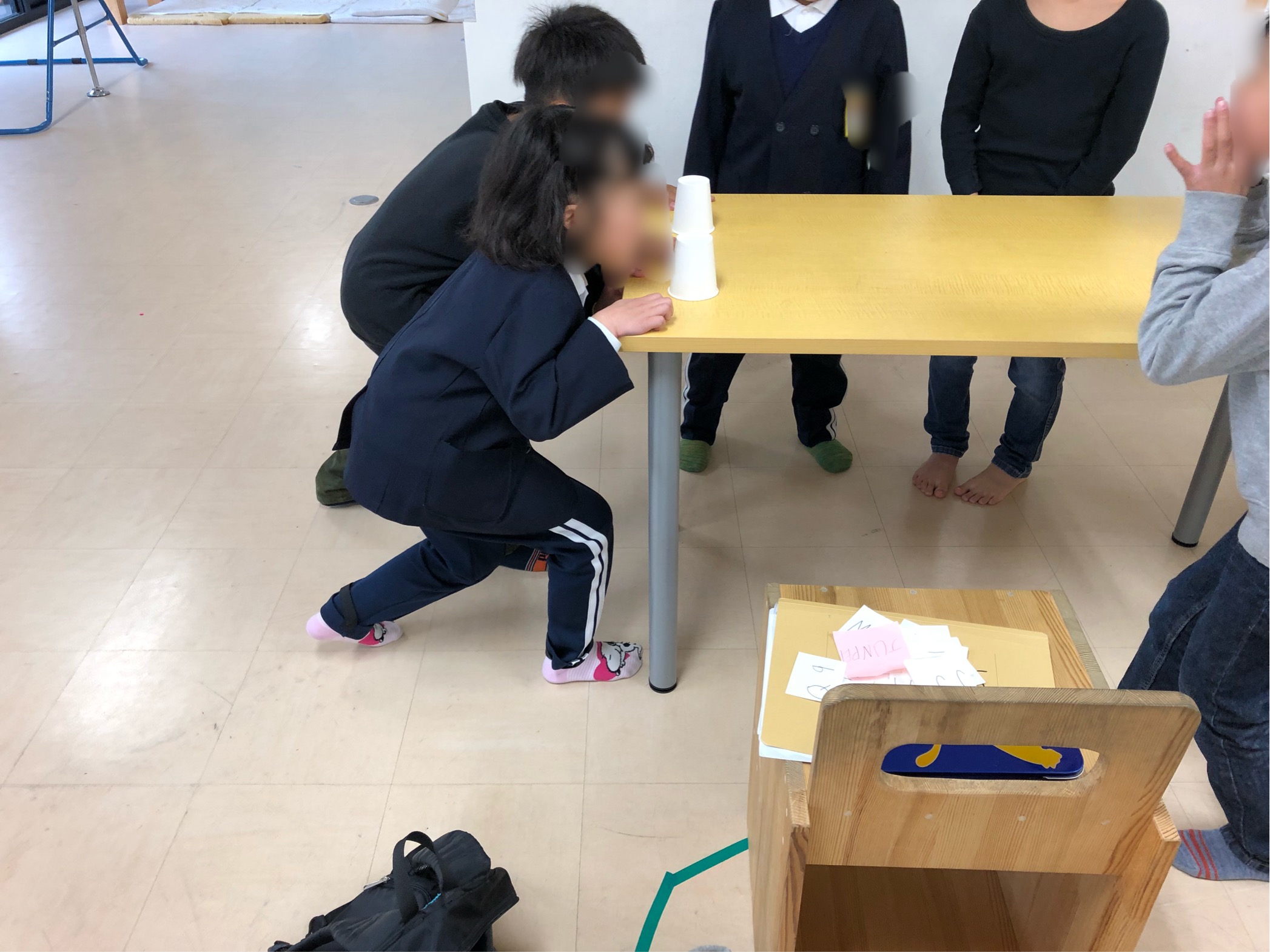 小1、小2クラスは今日はフォニックスで発音の練習。今日は特に「P」をきれいに発音するために、「P」の発音で紙コップ飛ばしてみました。「P」の発音